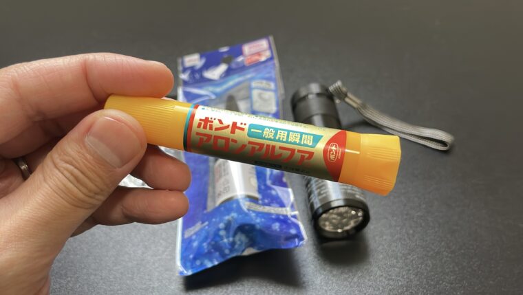 芯が出るように持って、瞬間接着剤が固まるまで保持しましょう。
